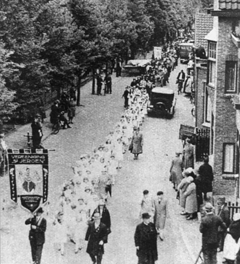 Foto van de jaarlijkse St. Jeroensprocessie die in 1931 voor de 40e maal werd gehouden. De stoet nadert vanuit de Wilhelminastraat komende het kruispunt met de Molenstraat, de Scheveningsestraat en – natuurlijk – de Sint Jeroensweg.