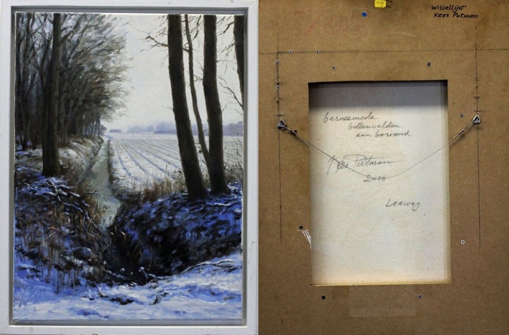 Een vrij recent schilderij van Kees Putman: besneeuwde bollenvelden aan bosrand (meer specifiek: de Leeweg). Te koop op catawiki.