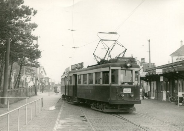 Een beeld om geen genoeg van te krijgen: de Blauwe op het eindpunt, Picképlein, Noordwijk aan Zee. Er moest enigszins gerangeerd worden om de bijwagen weer aan de goede kant van de tram te krijgen, dan kon het allemaal weer richting Leiden/Den Haag gaan.