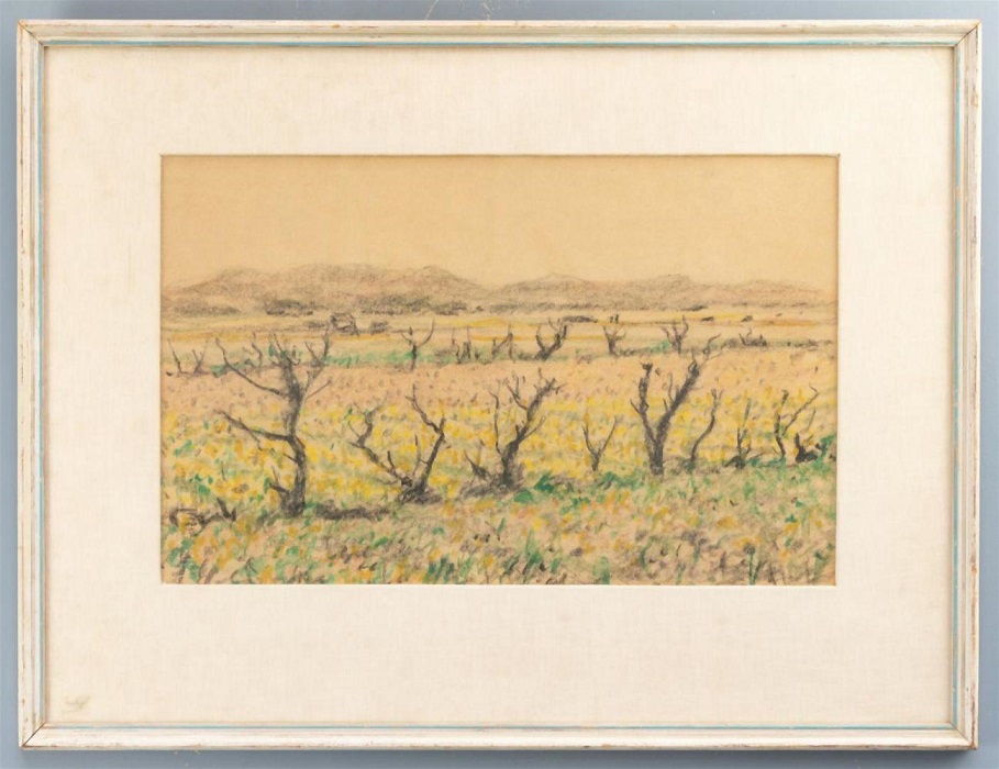 Het pastel is van de hand van de Russische kunstenaar Leonid Sologub (1884 – 1956) en getiteld “Bollenvelden met Beukenhagen bij Noordwijk”. Vraag is hoe een Russische kunstenaar helemaal in Noordwijk terechtkomt. Het is een heel verhaal, ik speel even leentjebuur bij de site van Galerie Amstel Art: