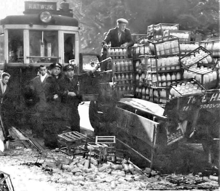 Het was een mooie boel aan de Rijnsburgerweg in Leiden: de tram naar KATwijk en een melkwagen van Theo – De KAT – Heemskerk uit Noordwijkerhout kwamen elkaar daar tegen en de begroeting tussen deze ‘katten’ was allerhartelijkst.