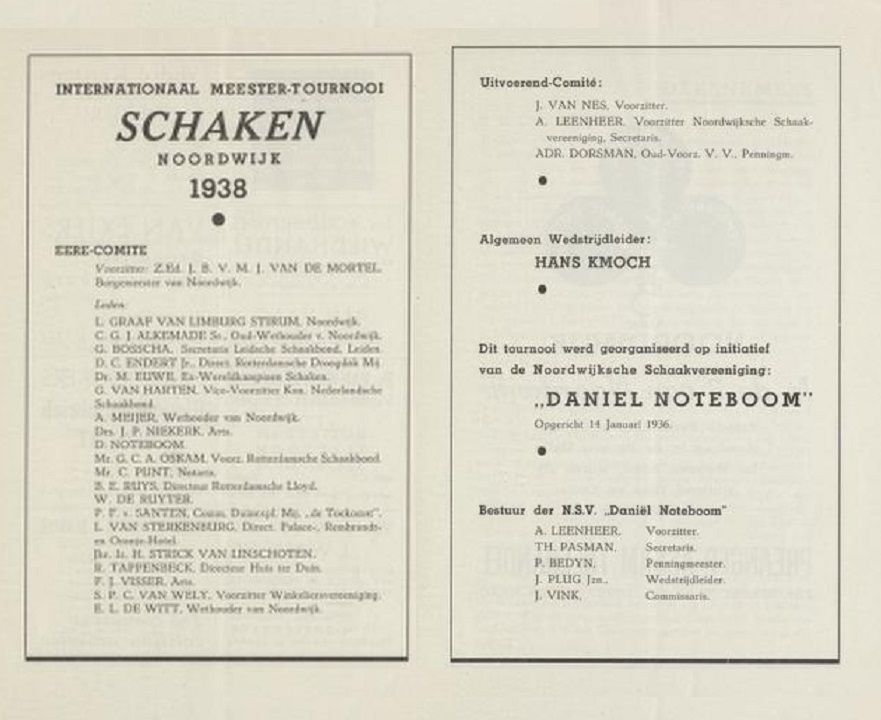 Het schaaktoernooi dat in 1938 werd georganiseerd in het Rembrandt Hotel in Noordwijk aan Zee heeft een zekere vermaardheid, niet in de laatste plaats omdat er een keur aan internationale grootmeesters, annex (ex-) wereldkampioenen aan meededen. Maar het erecomité dat achter het toernooi schuilging bestond uit een niet mindere keur aan Noordwijkse bestuurderen en middenstanders. Ook D. Noteboom had zitting in heterecomité. Dat was de schilder, niet diens zoon de schaker: die was al in 1932 overleden en was alleen virtueel aanwezig in de naam van de organiserende schaakvereniging, die zijn naam droeg.