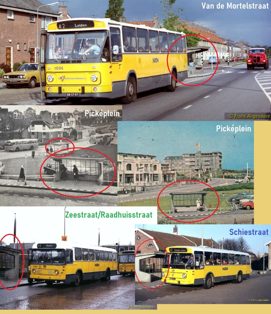 Tegenwoordig zijn er van die wachthuisjes voor de bus – ook wel ‘abri’s’ genaamd – die vrijwel geheel uit glasplaten bestaan. Alleszins transparant, maar weinig hufterproof. Vroeger was dat anders. De NZH in Noordwijk had op verschillende plekken in Noordwijk abri’s staan die zo ongeveer uit beton gegoten leken. Er zaten wel breekbare glazen ruiten in, maar die waren gemakkelijker vervangbaar dan een abri als geheel. In Noordwijk kan ik er mij uit mijn herinnering 5 herinneren: 2 op het Picképlein, 1 op de Van de Mortelstraat, 1 aan de Zeestraat/Raadhuisstraat en 1 aan de Schiestraat. Of waren er meer en zo ja, wáár dan?