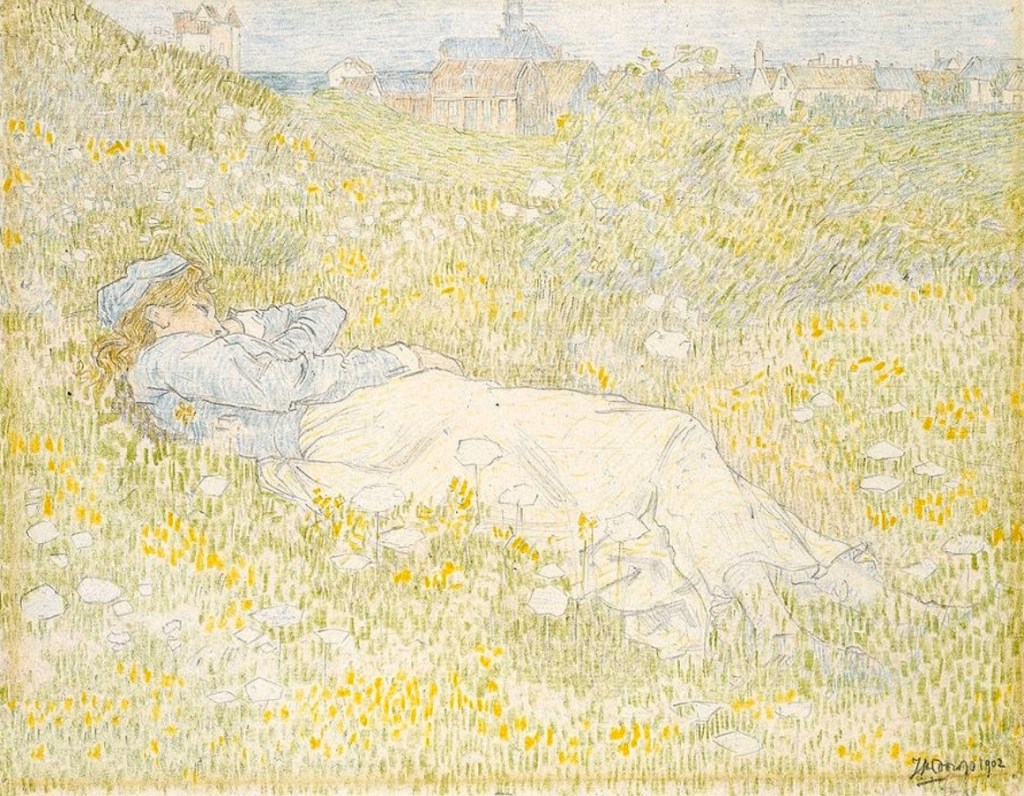 De schilder Jan Toorop (1858-1928) kwam vaak in Katwijk, maar van daaruit zat hij dicht aan tegen de intellectuelenkliek uit Noordwijk, in het bijzonder Albert Verwey. Zo leerde hij ook onder andere Henriëtte Roland Holst kennen, die wel onder de indruk was van Jan. Bovenstaand beeld – “Liggend Meisje in de Duinen bij Noordwijk aan Zee” – maakte hij tijdens één van zijn verblijven in de opkomende badplaats. Wie het meisje was, weet ik niet. Mogelijk een dienstmeid van Verwey. Of zomaar een deerne uit Noordwijk aan Zee. Het is in ieder geval één van de mooiste kunstwerken die ik van Noordwijk ken.