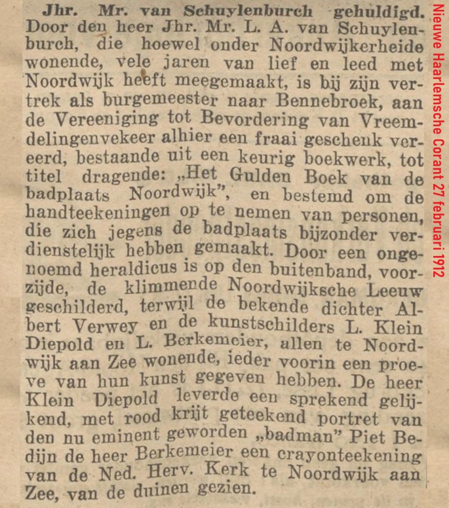 Jhr.mr. Leopold Adolf van Schuijlenburch was onder meer bestuurslid van de Noordwijksche Duinexploitatie Maatschappij en zat ook nog in het bestuur van de eerste Vereniging voor Vreemdelingenverkeer. Bij zijn afscheid in 1912 naar Bennebroek bood hij een bijzonder cadeau aan aan de Noordwijksche goegemeente: een Gulden Boek. Doel ervan was het opnemen in het boek van de handtekeningen van hen, die zich voor de badplaats uiterst verdienstelijk hadden gemaakt. Er moeten bovendien portretten in hebben gestaan van types als gemeentesecretaris Egbert de Groot en uitgever Adriaan Dorsman, gemaakt door Leon Senf. Albert Verwey leverde een gedicht en de schilders Ludolph Berkemeier en Leo Klein Diepold leverde eveneens, ongetwijfeld prachtig materiaal aan.