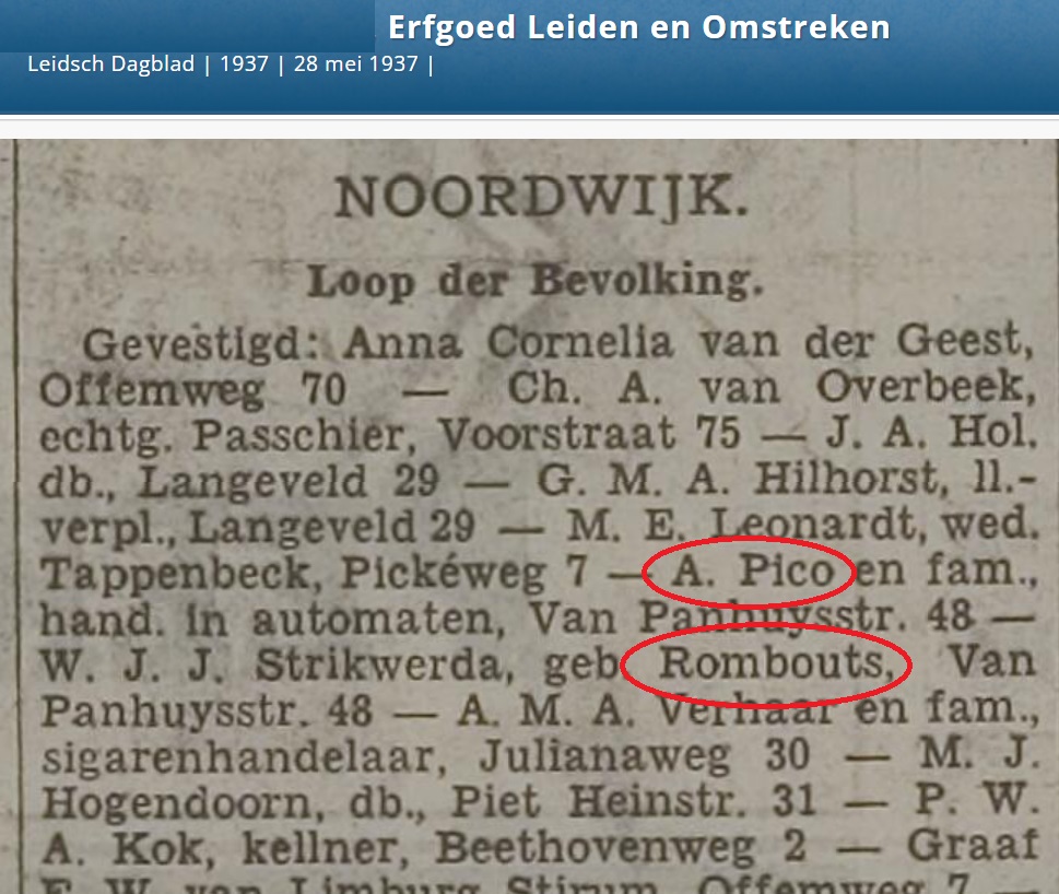 Het pension heette altijd al ‘Pirombo’ en het antwoord op de vraag hoe men in hemelsnaam aan die naam gekomen was is lange tijd in deze bloggenreeks blijven zweven. Het antwoord: ‘Pirombo’ is een acronym van de namen ‘Pico’ en ‘Rombouts’, die op enig moment de rechtmatige eigenaren waren. Waarschijnlijk ging het hier om een echtpaar, of om een ‘stel’, waarvan zij (voluit “Strikwerda-Rombouts”) gescheiden was en nu zogenaamd ‘in zonde’ samenleefde met ene Pico aan de Van Panhuysstraat nommer 48. Het ‘echtpaar’ runde in die tijd “de Eerste Noordwijksche Automatenhal” aan de Noordboulevard, ongeveer op de plek waar later café-restaurant ‘De Landbouw’ zou verrijzen.