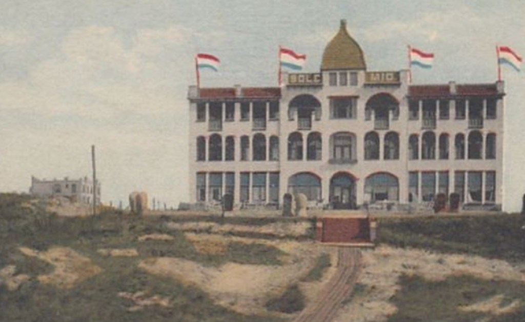 Sole Mio was ooit een familiepension, gebouwd door de gewaardeerde H.J. Jesse in opdracht van de Weduwe Lau Dirkzen. Maar de weduwe liet later een bevalliger pensionnetje neerzetten schuin aan de overkant dat later zou uitgroeien tot Pension Opduin. Ik tref op internet bovenstaande foto aan van speulende kinderen met een strandstoel en de vraag of dit Noordwijk is. Het antwoord is een volmondig ‘ja’. De kinderen spelen op het terras bij de voordeur van pension Sole Mio. Op onderstaande foto is te zien dat op die plek verschillende strandstoelen aanwezig waren, ook dewelke hier door de kinderen oneigenlijk wordt gebruikt.