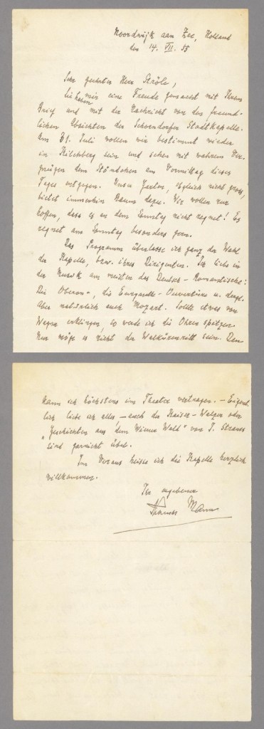 De Duitse auteur en Nobelprijswinnaar Thomas Mann (1875-1955) verbleef enkele keren in Noordwijk, meer in het bijzonder in Huis ter Duin. In de zomer van 1955 was hij er voor het laatst. Hij schreef er bovenstaande brief aan Hermann Ströle, kapelmeester van een muziekkorps uit Schrondorf in Zuid-Duitsland. Ströle zou op 24 juli bij de Mann’s in Kilchberg (Zwitserland) met zijn Stadtkapelle een concert geven, maar zo ver zou het niet komen. Thomas Mann kreeg op 20 juli – 6 dagen na het schrijven van de brief – een trombose krijgen in zijn been. Hij moest zo ongeveer van het strand af gedragen worden en werd op 24 juli naar Zwitserland gevlogen, waar hij op 12 augustus zou sterven. Voor de Schrondorfer Stadtkapelle restte alleen nog een Requiem voor de grote schrijver.