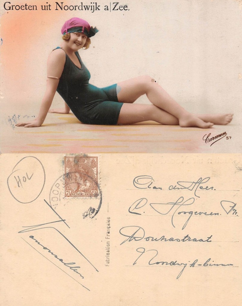 De bevallige deerne op de foto zal wel voor altijd anoniem blijven, ofschoon er rechts onderaan de naam ‘Carmen’ staat gedrukt. De kaart was – olala – van Frans fabricaat (het zal eens niet) en hij werd vanuit Noordwijk gestuurd aan een Noordwijker, woonachtig in de Douzastraat, ene C. Hoogeveen. Maar ja, daar is geen zoeken aan.