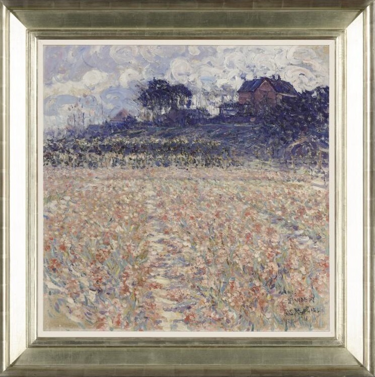 We hebben wel eens eerder aandacht gegeven aan de Amerikaanse schilder Joseph M. Raphael (1869-1950) en ook aan de bollenvelden, die bij hem favoriet waren als object van zijn kunst. Dit is er weer zo ééntje, getiteld “Flowering Fields, Noordwijk (Holland).” Rechtsonder is het volgende geschreven: Aan J. Viden/ Jos Raphael / Avril 1915. Joe was vaak in onze dreven te vinden, maar zijn (Europese) woonplaats was Ukkel in België. Vandaar dat ‘Avril’ op zijn Frans. Wie “J. Viden’ was, weten we niet. Het beeld lijkt er een te zijn van het Vinkenveld met op de achtergrond enkele villa’s in De Zuid. Of toch vanaf het Dompad onderaan de Prins Hendrikweg?