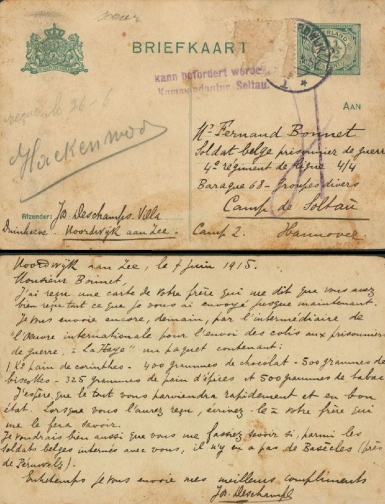 De kaart was afkomstig van ene Deschamps, die in 1915 verbleef in de Villa Duinhoeve in Noordwijk aan Zee. Wie Deschamps precies was is onduidelijk. Ik vermoed een Belgische vluchteling in de Eerste Wereldoorlog. Want hij stuurt een heel pakket met onder andere chocolade en tabak naar een Belgische krijgsgevangene in het concentratiekamp Soltau in Niedersachsen/Duitsland. Of die het ook daadwerkelijk zou krijgen is de vraag. De kaart kreeg hij in elk geval want de Kommandatur van het kamp stempelde er “kann befördert werden” op.