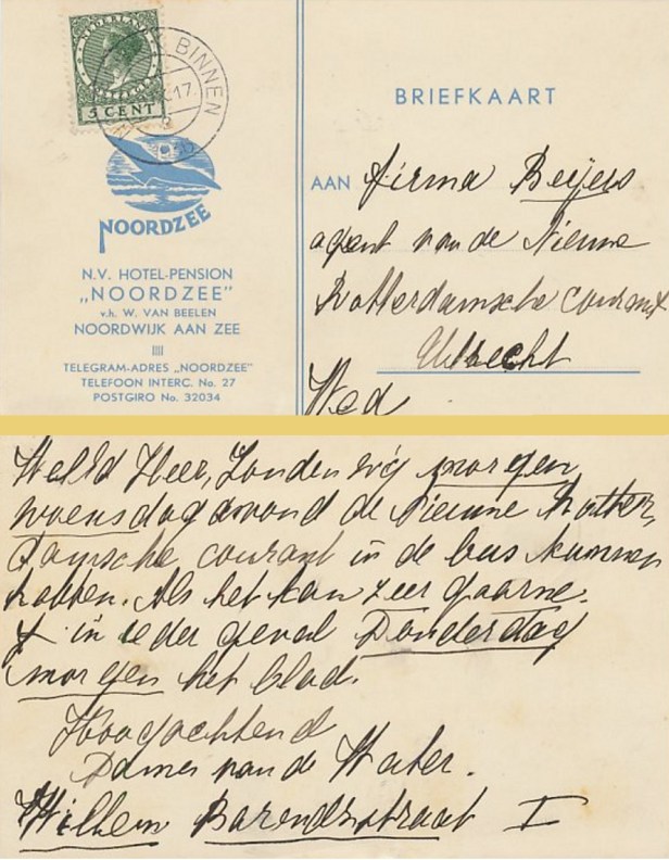 Omdat dit epistel gericht was aan de NRC-agent in Utrecht kunnen we gevoeglijk aannemen dat hier de Willem Barendszstraat in Utrecht werd bedoeld. Waarom het allemaal op een briefkaart van Hotel-Pension Noordzee te Noordwijk geschreven moest staan, weten we niet. Misschien logeerden de dames in “Noordzee” en zouden ze ’s anderdaags naar hun eigen woon- en verblijfplaats in Utrecht terugkeren.
