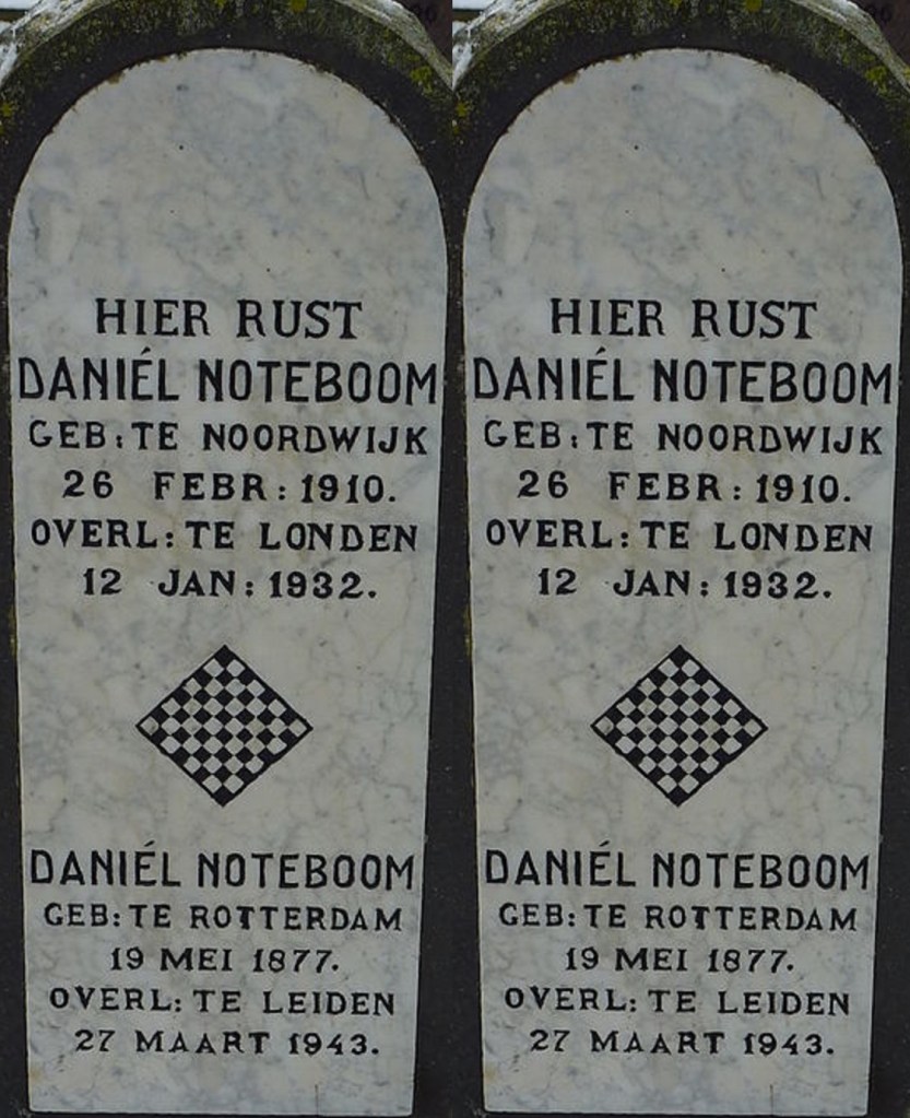 Zo naast elkaar gezet lijken het de Stenen Tafelen van Mozes wel. Maar het is maar één grafsteen voor twéé Daniels Noteboom. De schaker en de schilder , de zoon en de vader. De grafsteen bevindt zich op de Algemene Begraafplaats in Noordwijk aan Zee.