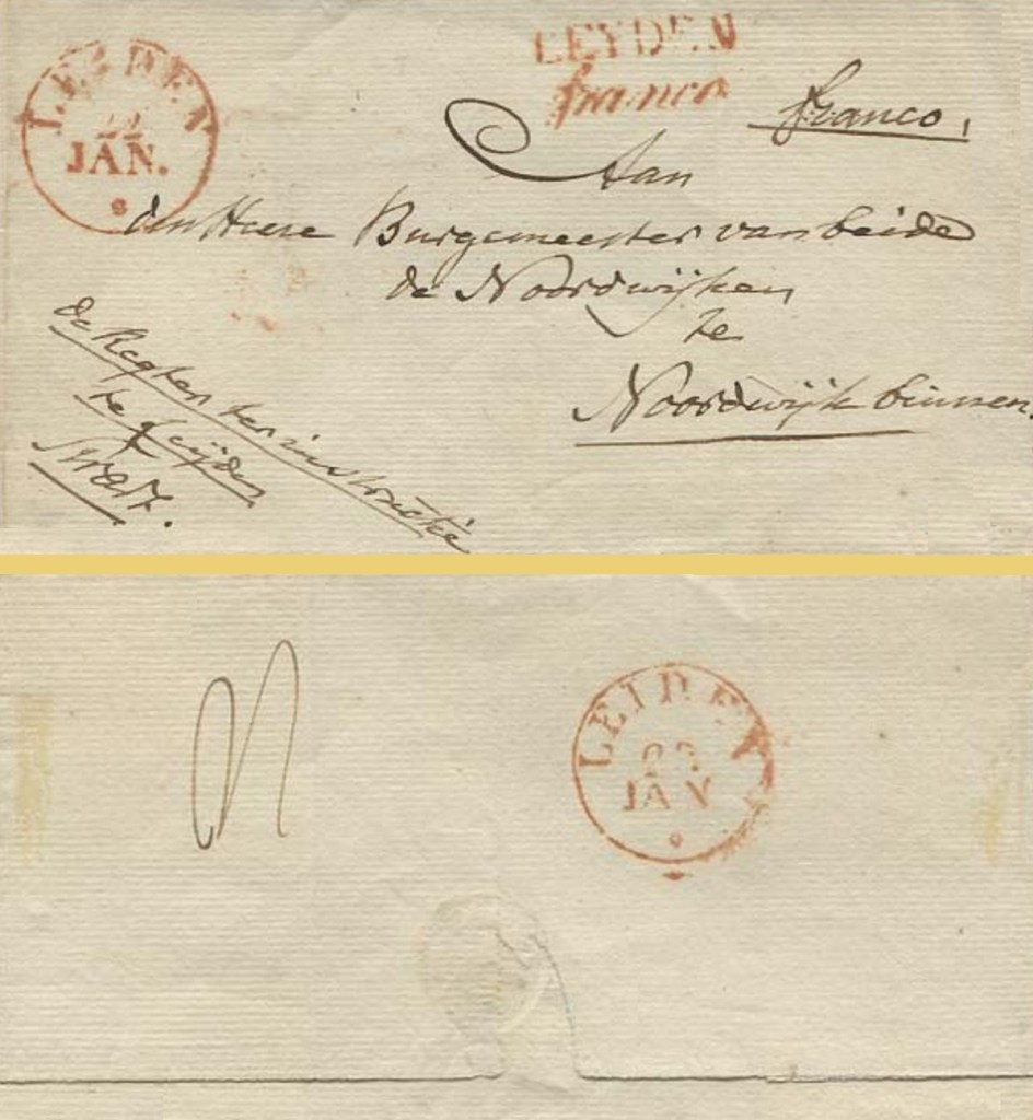 De brief ‘liep’ op 22 januari 1830 en was gericht aan ‘Den Heere Burgemeester van beide de Noordwijken.’ Hij was afkomstig van ‘de Regter ter Instructie’ uit Leiden. Tegenwoordig zou zo iemand ‘rechter-commissaris’ heten, een functionaris bij wie in strafzaken de leiding van het gerechtelijk vooronderzoek berust. Wat er aan de hand was, weten we niet.