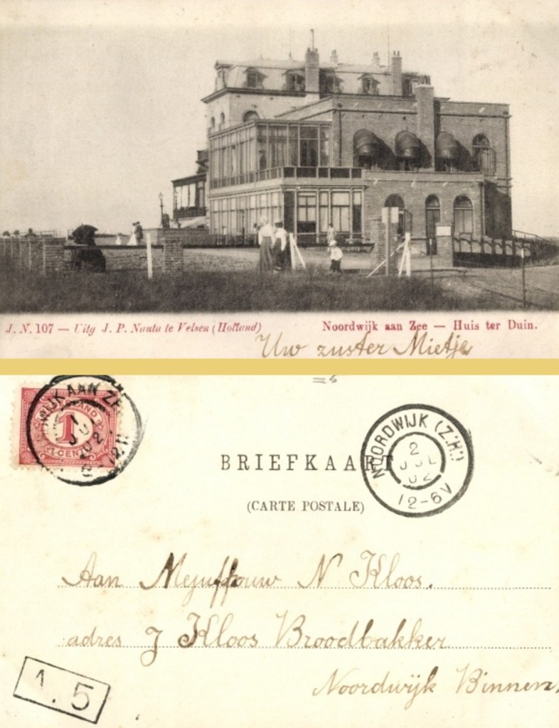 Bovenstaande kaart was gericht aan Neeltje en afkomstig ‘van uw zuster Mietje’. Gelet op het parmantige handschrift vermoed ik dat Mietje een koosnaam was van Maria, de oudste van het stel. Die was toen 14 jaar en de kaart moet een grapje geweest zijn: de kaart van Noordwijk aan Zee werd zowel in Noordwijk aan Zee als in Noordwijk Binnen afgestempeld, respectievelijk op 1 juli 1902 vóór twaalven en op 2 juli 1902 na twaalven. Hattie er toch maar mooi een dag over gedaan om van Zee naar Binnen te komen. Ongetwijfeld tot genoegen van Neeltje én Mietje.