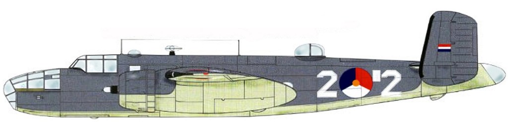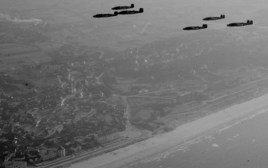 Een formatie van zes North American B-25C/D Mitchell vliegtuigen van vliegtuigsquadron 320 (VSQ 320) van de Marine Luchtvaartdienst (vliegveld Valkenburg). De formatie vliegt hier bijna boven Noordwijk aan Zee. Links onder aan de Wilhelmina Boulevard het Hotel Palace. De foto is gedateerd op 25 februari 1953, maar daar zet ik een vraagteken bij. Kort daarvoor, op 1 februari 1953, had de grote stormramp plaatsgevonden, waarbij ook delen van de Noordboulevard werden weggeslagen. Op de foto lijkt het dat er niets meer aan de hand was en dat gemeentewerken met behulp van een roedel stratenmakers de schade allang had hersteld. Lijkt me sterk.