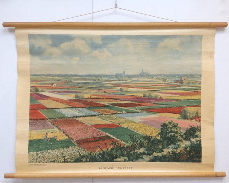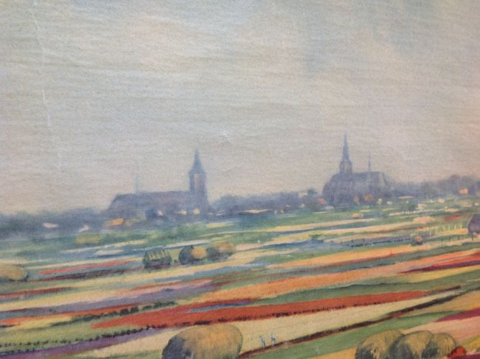 Het beeld biedt een zicht op de bollenvelden ten noorden van Noordwijk, ik schat in de bollenvelden in de Bronsgeest. Op de achtergrond de twee torens van Noordwijk Binnen. Een beetje uitvergroot: