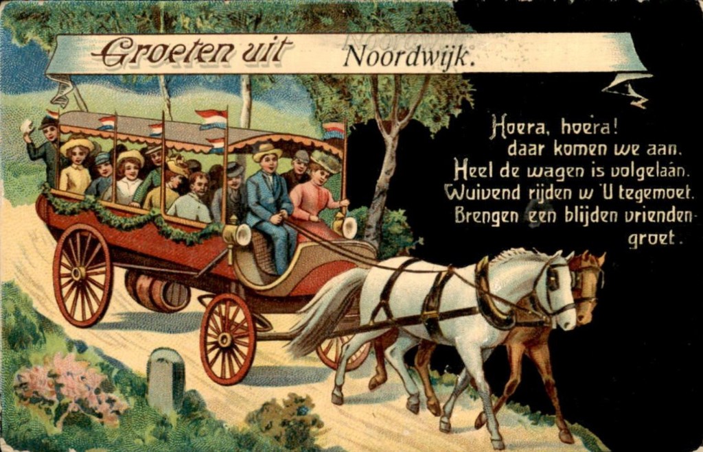 De afbeelding betreft vrolijk volk in een zogenoemde ‘Jan Plezier’: een vierwielig landelijk rijtuig met koetsiersbok, voorzien van een los winterdak. De passagiersbanken waren in langsrichting geplaatst en de hele brik was geschikt voor zowel dubbel- als meerspan paarden. In Noordwijk beschikte de firma Beuk over zo’n ding, geel en zwart geverfd. Naar verluidt moeten mijn grootouders er gebruik van hebben gemaakt bij gelegenheid van hun zoveel jarig huwelijk, waarbij alle bruiloftsgasten werden meegevoerd op een ritje door de streek. Eveneens ‘naar verluidt’, moeten enkele ooms, beneveld van de jenever, ruzie hebben gekregen en gingen ze rollebollend door de bak.