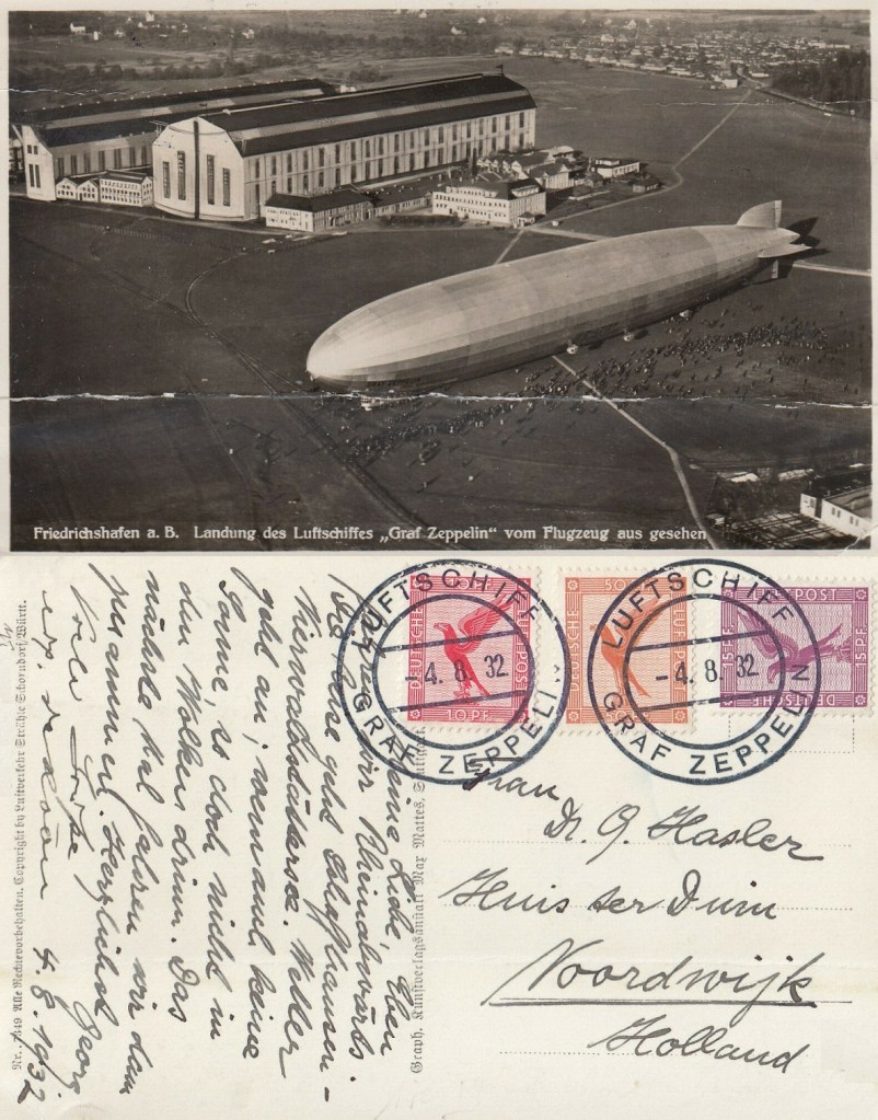 Georg Hasler stuurde op 4 augustus 1932 deze kaart aan zien liefie in Huis ter Duin. Hij maakte een trip ‘Rheinabwärts’ met de Graf Zeppelin, het reusachtige luchtschip dat – volgens mijn opa – ook wel eens over Noordwijk was gedreven. Op het moment van schrijven was het luchtschip op weg van Schaffhausen richting Vierwoudstrekenmeer in Zwitserland. ‘De volgende keer’, zo beloofde hij zijn eega, ‘maken we het reisje samen’.
