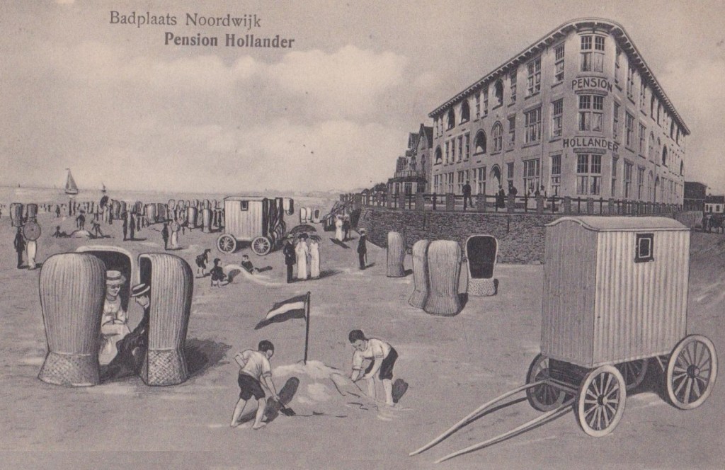 Op al mijn strooptochten op internet ben ik deze kaart nog niet tegengekomen. Bijzondere tekening, al is het alleen al vanwege het feit dat vóór Pension Hollander alleen een stenen muur de afscheiding met het strand bepaalt.