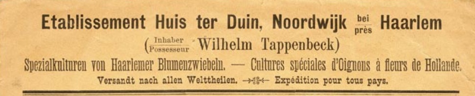 Briefhoofd van het bloembollenbedrijf van Wilhelm Tappenbeck met hier en daar een wat eigenaardig, zo niet foutief taalgebruik. De bloembollen heten in het Frans afkomstig te zijn uit Holland, maar in het Duits meer specifiek uit Haarlem. ‘Versandt’ = verzonden, maar ‘expedition’ = verzending. En je kunt in het Duits nog zoveel werelddelen voor ogen hebben, je schrijft ze dan wel als ‘Weltteile’, dus zonder ‘h’.