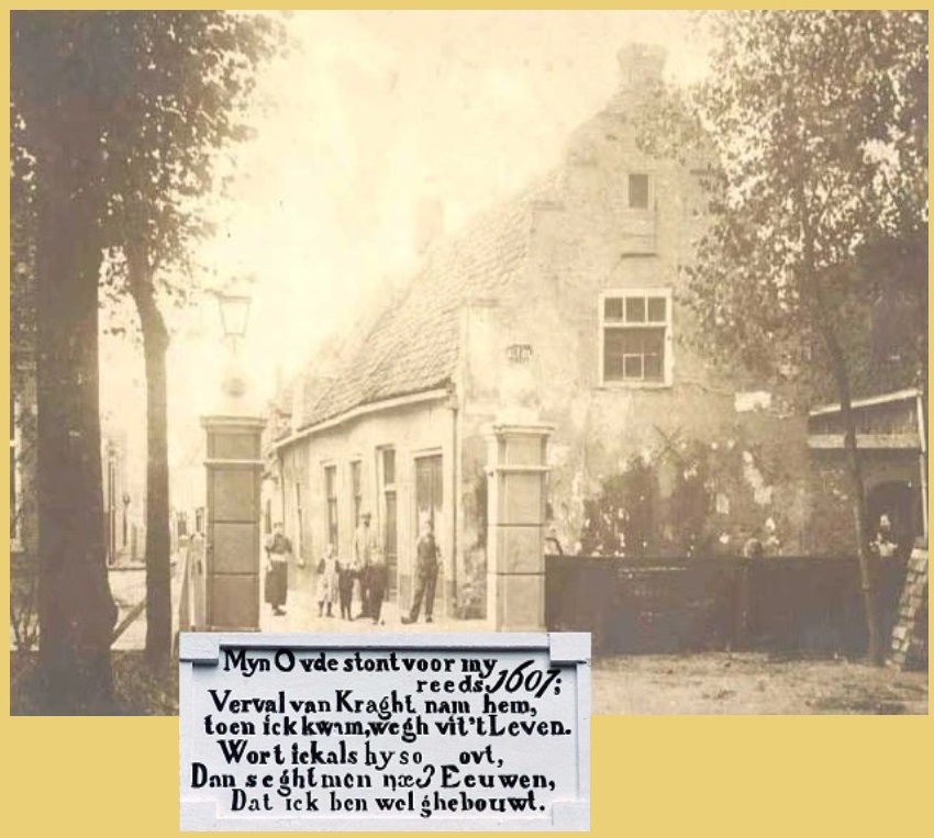 “Mijn Oude” in de tekst was een herberg die op deze plek stond en die in 1895 werd afgebroken om plaats te maken voor het huidige pand. Die herberg zag er zo uit: