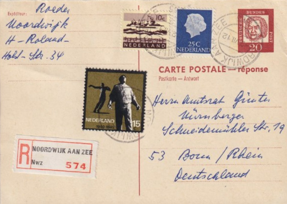 Een wat curieus gefrankeerde kaart van Noordwijk naar Duitsland. De briefkaart zelf is van oorsprong een Duits exemplaar, maar wordt – aangetekend – gefrankeerd met Nederlandse postzegels, waaronder één zegel die de oorlogsjaren 1940-1945 herdenkt.