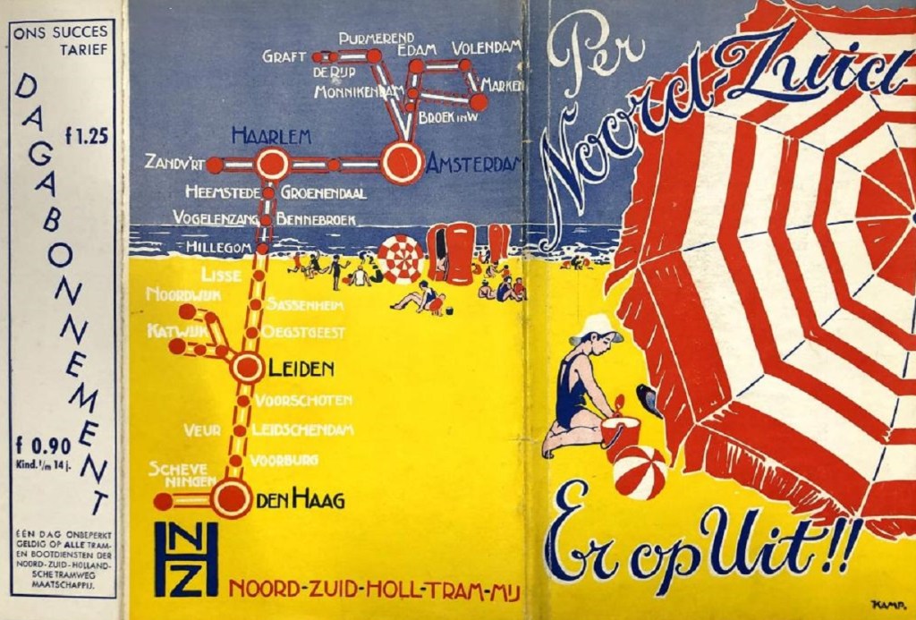 Folder uit de collectie van het NZH-museum in Haarlem. De folder verhaalt alleen van de tramlijnen van de NZH, die dan ook volledig heette “Noord-Zuid-Hollandsche-Tramwegmaatschappij (NZHTM).
