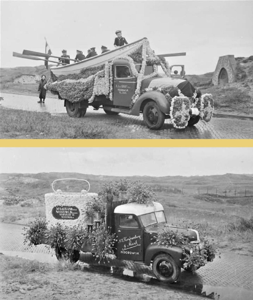 Ron komt met deze twee prachtige opnamen van twee opgeleukte vrachtauto’s. Bij optochtelijke gelegenheid van het 100-jarig bestaan van de badplaats, neem ik aan, in 1966. Ik kom her en der weinig foto’s tegen van ‘Noordwijkse’ vrachtwagens, terwijl ik me uit mijn jeugd een flink aantal kan herinneren (Brouwer, Salman, Van der Putten, Gemeente Noordwijk, Kloos, Beuk, Kooymans, veel Opels Blitz). Mede daarom zijn deze opnamen zo bijzonder: een auto van P.J. de Groot (Volvo?) en één van Konijnenburg & Mark (?). Wie heeft er meer van dit soort oude Noordwijkse vrachtwagenplaatjes?