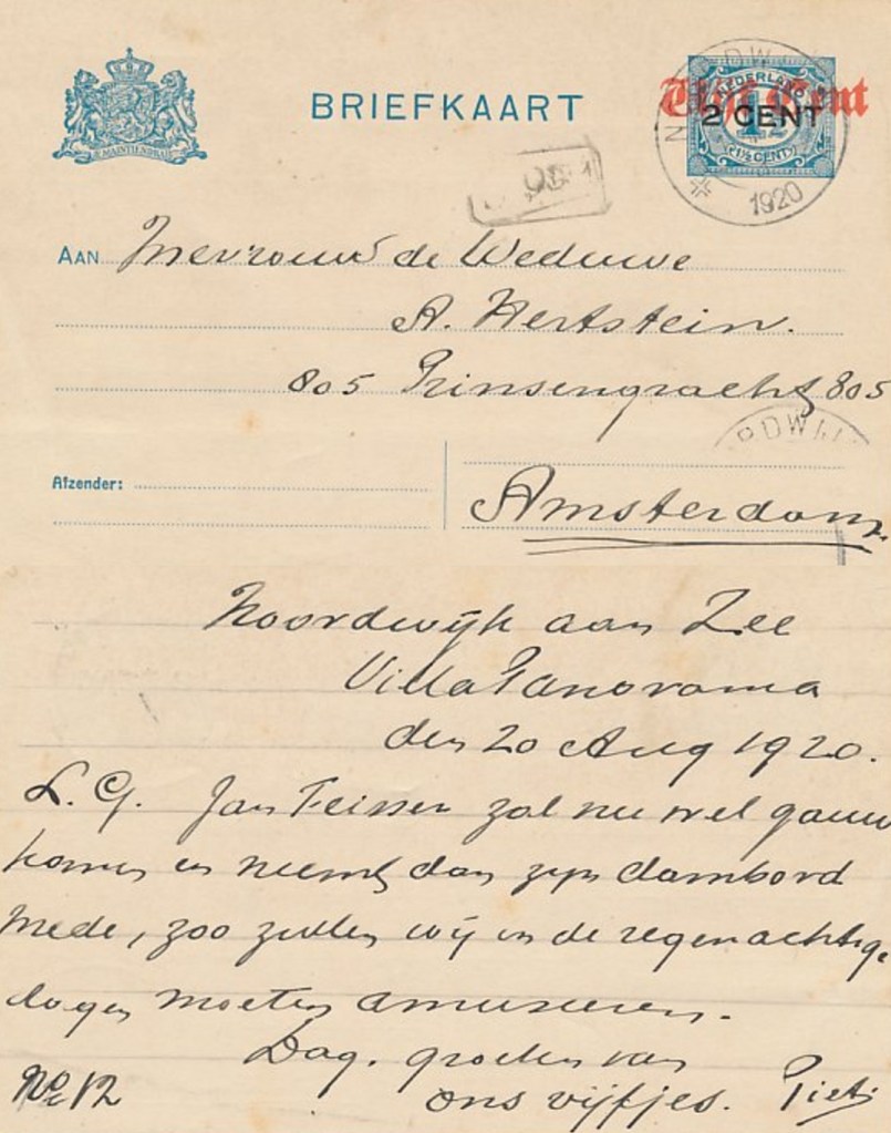 Piet berichtte aan een kennis of familielid in Amsterdam dat alleszins reden was te veronderstellen dat hij zich de komende dagen in Pension Panorama zou moeten amuseren met een dambord. Verzoek was dan ook om zo’n dambord mee te nemen ‘in de regenachtige dagen.’ De somberheid van Piet over het weer en de amusementsmogelijkheden hadden een oorzaak: op 20 augustus 1920 – de dag dat Piet zijn missive schreef – was er volgens de weerberichten uit die tijd 0% zonneschijn, viel er 28 mm regen en was het relatief stervenskoud voor de tijd van het jaar: 11.7°C.