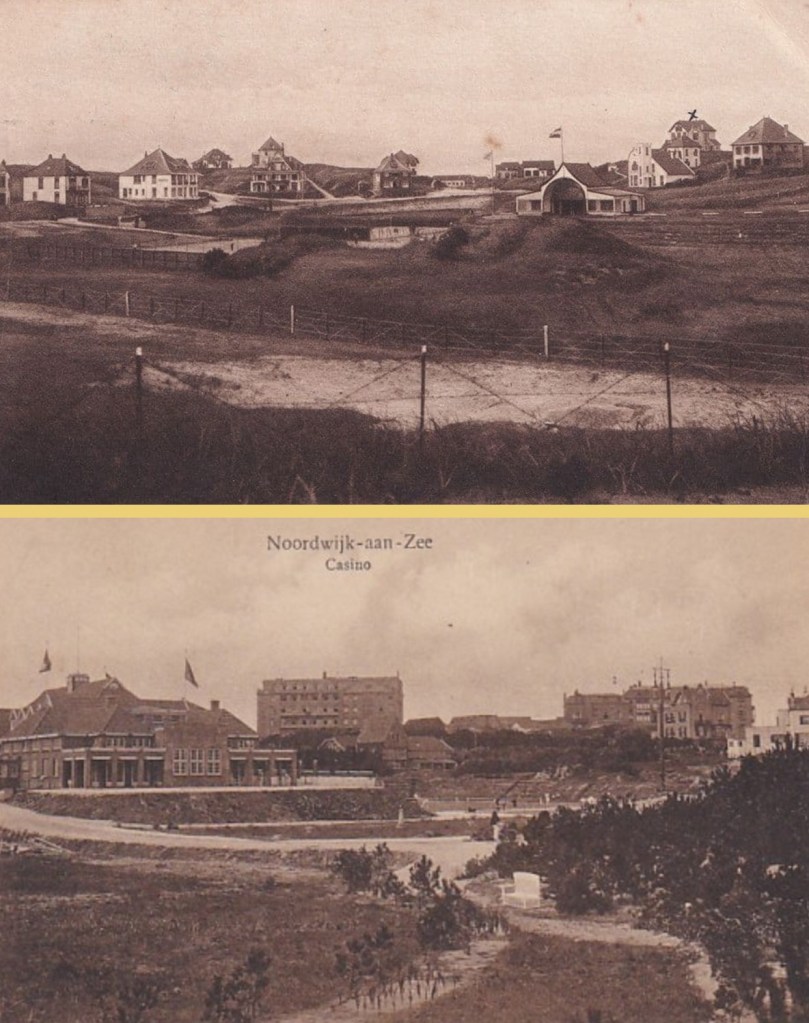 De Noordwijksche Sportvereeniging dateerde van 1908 en rond die tijd moet zij haar eerste tennisbanen hebben laten aanleggen en haar eigen sociëteit hebben laten bouwen. De bovenste foto getuigt van die begintijd. Met de onderste zijn we alweer een stuk verder in de tijd en heet het hier ‘Casino’.