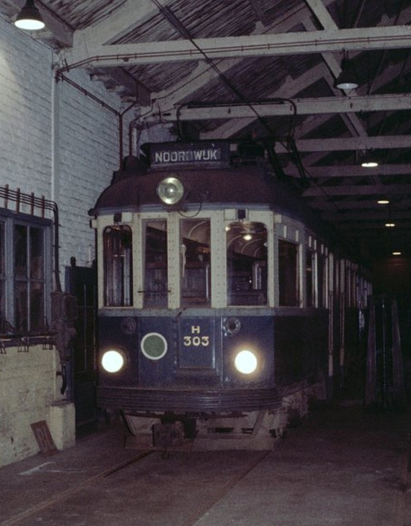 Weemoedige foto op de facebookpagina van de Oude Blauwe Tram: een tram, de A508 omgekat tot H303, staat in de remise te Rijnsburg op 13 november 1961. Dat moet zo ongeveer kort vóór haar totale destructie geweest zijn, want van de trams bleef na hun uit diensttreding niet veel meer over. Waarom deze tram nog ‘Noordwijk’ als bestemming had, is een raadsel. De lijn tussen Leiden en Noordwijk werd al in oktober 1960 – dus een jaar eerder – opgeheven. De tram zou Noordwijk nooit meer aandoen.