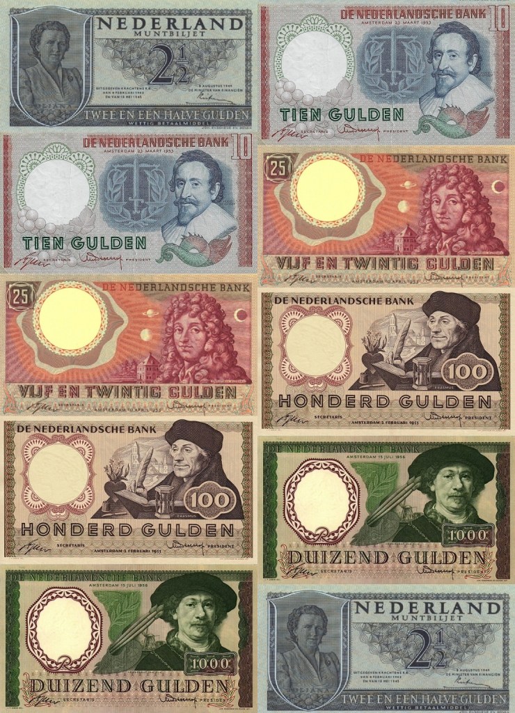 Op een joet was Hugo de Groot afgebeeld, op een geeltje Christiaan Huygens (met op de achtergrond diens nog steeds bestaande huis Hofwijck in Voorburg). Op een meier stond Erasmus en op een rooie rug Rembrandt van Rijn. Op een briefje van een knaak stond toenmalig Koningin Juliana, maar met alle respect: die hoorde in dit rijtje kunstenaars/geleerden eigenlijk niet thuis.
