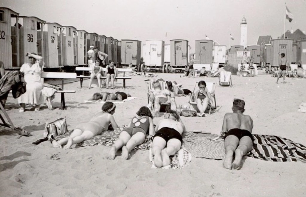 Ron komt op facebook met deze wat mij betreft ongekende foto van badende figuren bij een hele reeks aan badkoetsjes, die zo ongeveer op het punt staan hun functie te verliezen om daarna nog jaren door te gaan als verkleedhut in het latere Oranjebad. Op beide foto’s herkennen we nog de ’34er’.