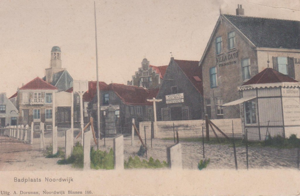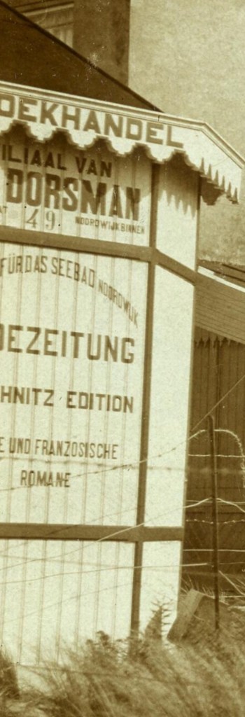 Wat mij betreft mogen ze de kiosk rechts op de foto heropbouwen en ‘m zijn plek in de zeereep teruggeven. Adriaan Dorsman kreeg later wel een winkeltje op Zee (onder het nog te bouwen Palace Hotel), maar eerder dreef hij deze kiosk en die is van een melancholerische schoonheid. Ik heb ‘m wel eens eerder laten zien. Het ding was ook publicitair beschreven met zaken die hier aan de orde waren: er stond: boekhandel en Filiaal van A. Dorsman Noordwijk BInnen en …. für das Seebad Noordwijk en Badezeitung en …. hnitz (?) Edition en Deutsche und Französische Romane.
