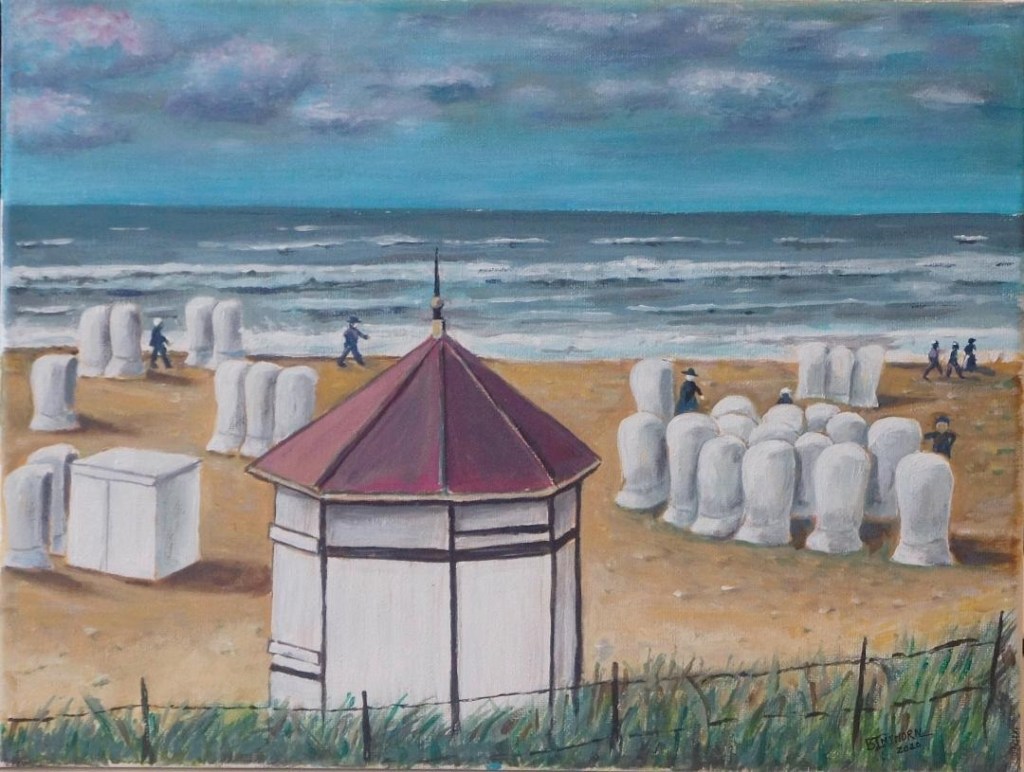Onlangs plaatste ik twee foto’s van de kiosk van Adriaan Dorsman die aan het begin van de vorige eeuw in de zeerreep stond nabij de strandopgang aan het einde van de Hoofdstraat. Bill maakt mij erop attent dat diezelfde kiosk later dienst deed als onderkomen van de badman op het strand. Hij maakte er ook een mooi schilderij van: