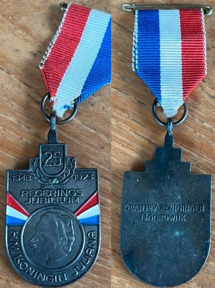 Bij het 25 jarig regeringsjubileum van toenmalig Koningin Juliana in 1973 werd een speciale medalje uitgegeven. Of dat specifiek een uitgave was van de Oranjeverenigingen (er waren er twee!) in Noordwijk is me niet duidelijk. Maar het jubileum werd in ieder geval in de beide Noordwijken gevierd.