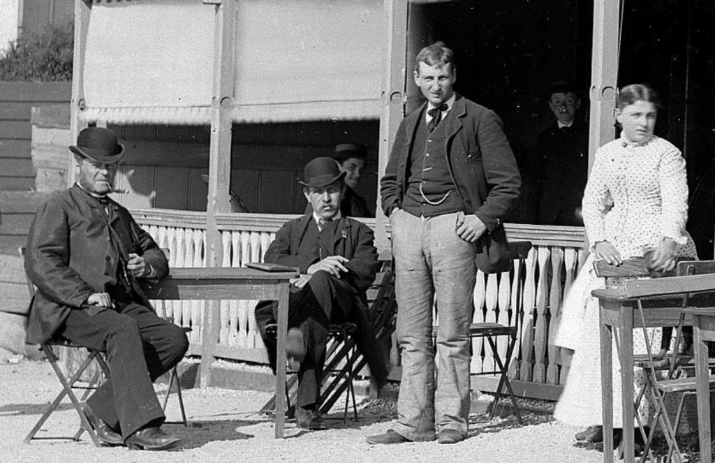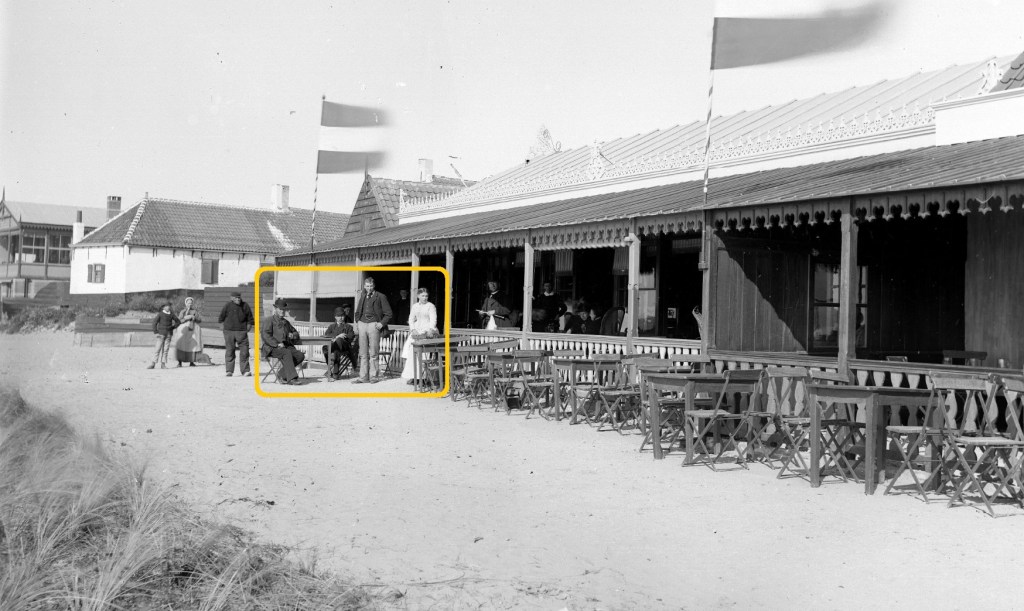 Bovenstaande foto is een uitvergroting van een bredere plaat, genomen voor het badhotel van Konijnenburg. Hij komt van een glasnegatief en wat je ook kunt zeggen of schrijven over oude photographieën, een glasplaat negatief had een scherpte waar tegenwoordige hooggepixelde foto’s een puntje aan kunnen zuigen.