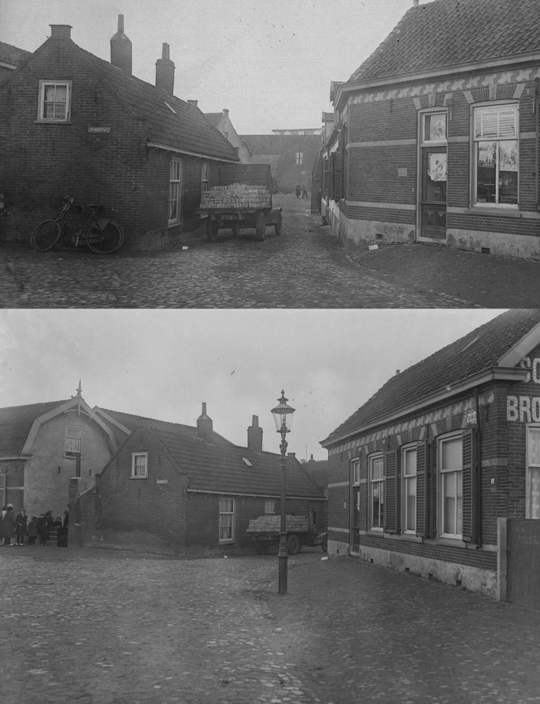 Het is een kijkje vanaf – volgens mij – vanaf de Nicolaas barnhoornweg richting Jan Kroonsweg met op de hoek rechts een bakkerswinkel (in mijn tijd die van Hogewoning). Op het pand links staat ‘Jan Kroonsweg’ geschreven. De beide foto’s zijn kort na elkaar genomen, gelet op de geparkeerde vrachtwagen met stenen. Alleen heeft iemand de op de hoek geparkeerde fiets gepikt.
