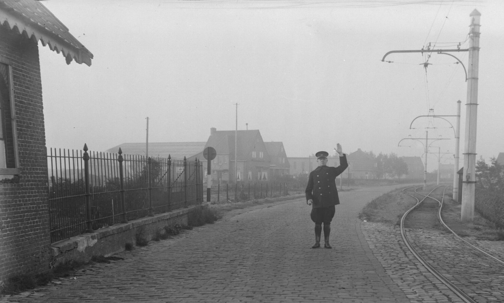 Een onverbiddelijk lid van de Noordwijkse Hermandad dwingt de fotograaf tot stoppen aan het begin van de Herenweg. Links nog het huisje van Van Woersem (als ik me niet vergis). Waarom de fotograaf niet verder mocht, is mij onbekend.