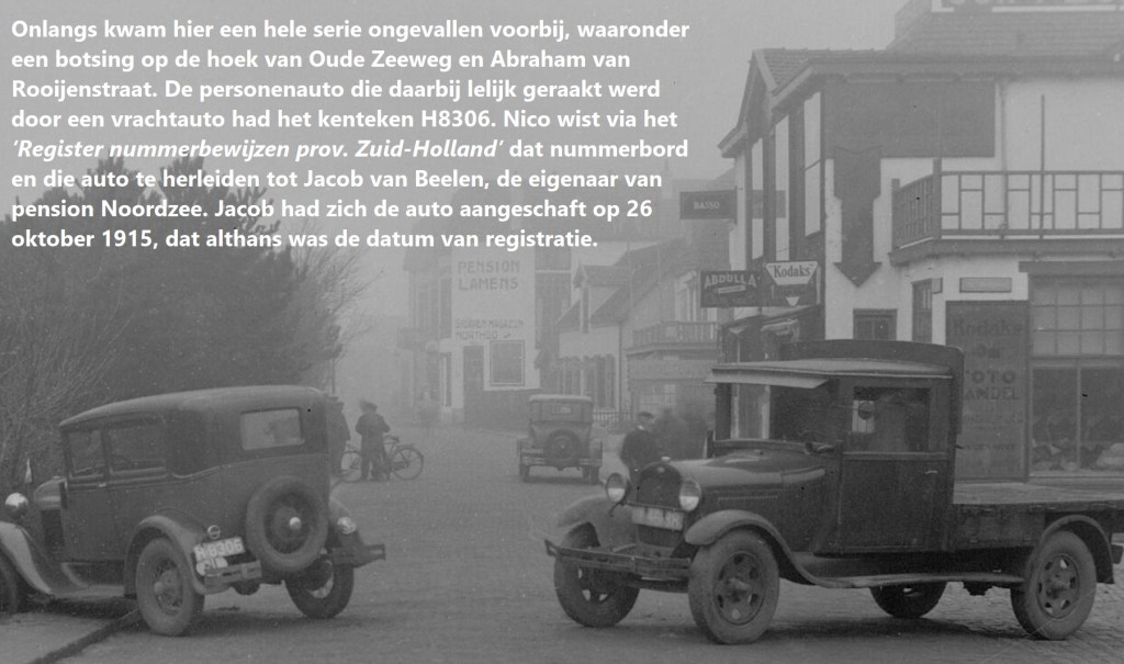 De geraakte auto is zeker van na 1915, misschien wel van een eind in de jaren 1930. Denk erom dat een kenteken op jouw naam stond en niet op de auto. Auto ingeruild ? Zelfde kenteken met nummerbord op jouw naam kwam op je nieuwe auto ! Hier kunnen we zeggen dat Van Beelen zijn eerste auto werd geregistreerd op 26 oktober 1915.