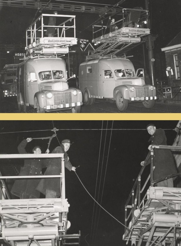 Op de beide foto’s is van ‘onderhoud geen sprake meer: werklui zijn hier bezig op de Blauwpoortsbrug in Leiden met het weghalen van de bovenleiding, nadat de allerlaatste tram hier gereden had.