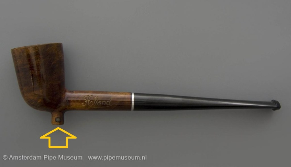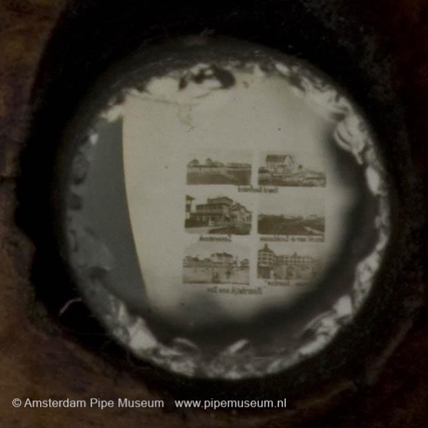 In “The Amsterdam Pipe Museum” bevindt zich deze tabakspijp met een zgn. ‘hiel’ aan de onderkant. Die hiel is doorboord en in het ontstane gaatje is een Stanhope glaasje aangebracht met vier minuscule prentjes van badplaats Noordwijk.