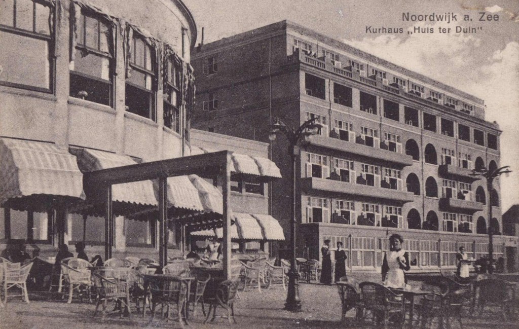 Een mij onbekende foto van Huis ter Duin, waar de serveerploeg bezig is het terras weer gereed te maken voor een mooie zomer.