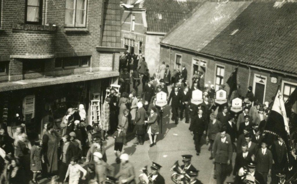We schrijven 24 april 1933 en ook in Noordwijk werd de 400e geboortedag gevierd van niemand minder dan Willem de Zwijger. Feestelijkheden rond deze vaderlandse figuur vonden overal in Nederland plaats en het gemeentebestuur van Noordwijk meende dat aan dit gedenkwaardige feit niet ‘stilzwijgend’ voorbij kon worden gegaan – zoals in een raadsvergadering werd opgemerkt. Stilzwijgend zal het niet geweest zijn, sterker nog: de optocht door het dorp (hier op de hoek van Zeestraat en Molenstraat) trok veel volk dat ongetwijfeld veel herrie maakte. En als ze geen herrie maakten, was er nog de muziek (van Excelsior?).