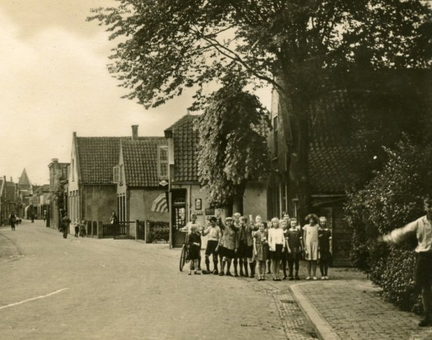 Oploop van een roedel kinderen, die in de Molenstraat spontaan poseerden voor de fotograaf. Waarom en wie en hoezo is niet helemaal duidelijk. Kinderen op weg naar hun school in de Sint Jeroensweg of in de Wilhelminastraat? Weten we niet. Op de achtergrond het drogisterijwinkeltje dat in mijn tijd gerund werd door Aad Berkhout. Maar of die er toen ook al zijn geurige nering bedreef?