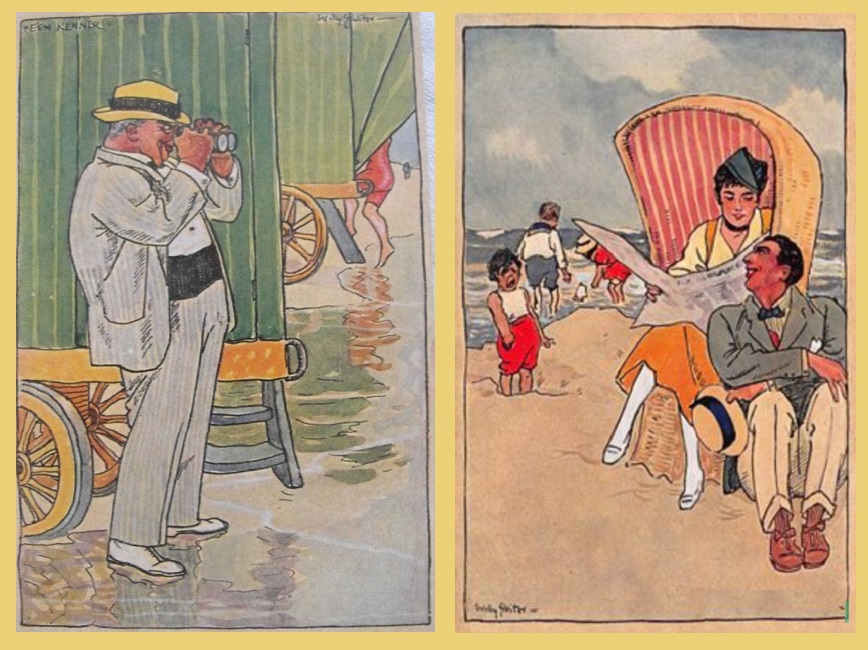 De tekeningen zijn respectievelijk getiteld ‘De Kenner’ en ‘De Kinderjuffrouw’ (let vooral op dat jengelende jongetje links) en ze vertellen vanzelf een (ondeugend) verhaal. Ze werden gemaakt door ene Willy Sluiter en ze werden op kaart uitgegeven door de firma Weenenk & Snel in Den Haag. Ongetwijfeld was er ergens in Noordwijk wel een winkelier die deze kaarten verkocht. Ongetwijfeld.