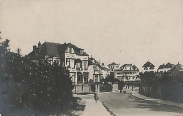 Links “Pension Van Leeuwen”, dat bij nadere bestudering onder auspiciën stond van ene ‘G. van Leeuwen’, maar daar loop mijn spoor dan ook direct bijster. Niet terug te vinden, die G. van Leeuwen. In het pand zat eerder het ‘Centraal Genootschap voor Kinderherstellings- en Vacantiekolonies’, waaraan we al eens eerder aandacht hebben gegeven.