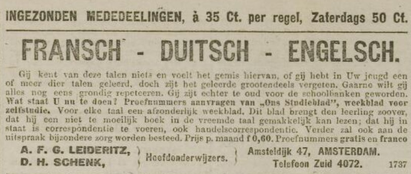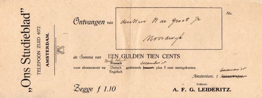 Kwitantie voor een abonnement op “Ons Studieblad.” Op naam van H. de Groot Jz. Ik vermoed dat het ging om Hubertus de Groot (1893-1962), een zoon van Jacobus – Kleine Koosie – de Groot. “Ons Studieblad” was een weekblad voor zelfstudie, zo maak ik op uit een advertentie voor het blad uit 1919. Wat Hubertus nu precies wilde leren, is niet duidelijk. ‘Frans’; is doorgestreept, alleen Engels en Duits zijn blijven staan, maar er is ook bijgeschreven “Herh. School.” Een opfriscursus? In 1915 (uit dat jaar stamde de kwitantie) was Hubertus pas 22 en blijkbaar hattie een opfriscursus nodig. Of wilde Kleine Koosie dat zijn zoon wat buitenlandse talen leerde, opdat hij met zijn handel ook in de export kon?