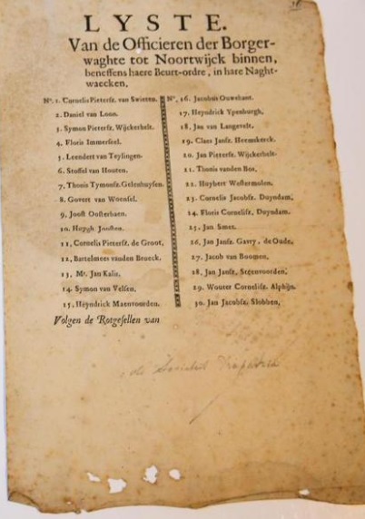 Gedrukte `Lyste van de officieren der Borgerwaghte tot Noortwijck binnen, beneffens hare beurt-ordre in hare naghtwaecken’. De lijst stamt uit 1830, blijkbaar hield men er toen nog een nachtwacht op na. In totaal staan er dertig namen op de lijst in twee kolommen. Onder meer: Van Swieten, Van Loon, Wijckerhelt, Immerseel, Van Teylingen, Van Houten, Van Woensel, Oosterbaan, Kalis, Moenvoorden, een paar Duyndammen, Slobben, een onvermijdelijke Steenvoorden, etc.